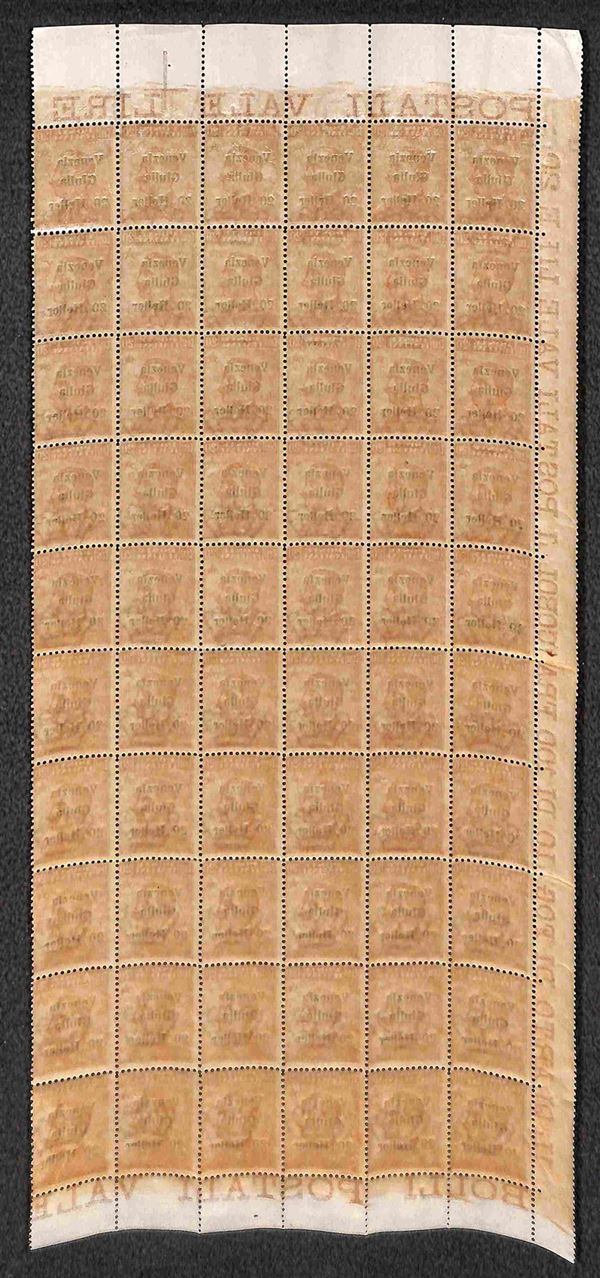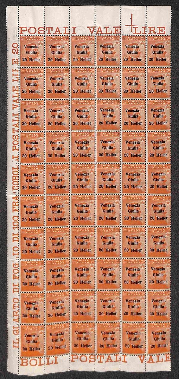 1919 - Blocco di sessanta completo di margini del 20 heller su 20 cent (31) con varietà ch e altri errori di composizione - gomma integra