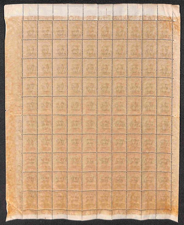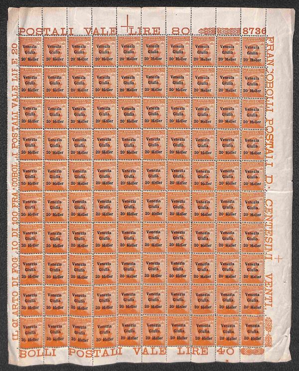 1919 - Intero foglio completo di margini del 20 heller su 20 cent (31) con varietà cb e altri errori di composizione - gomma integra