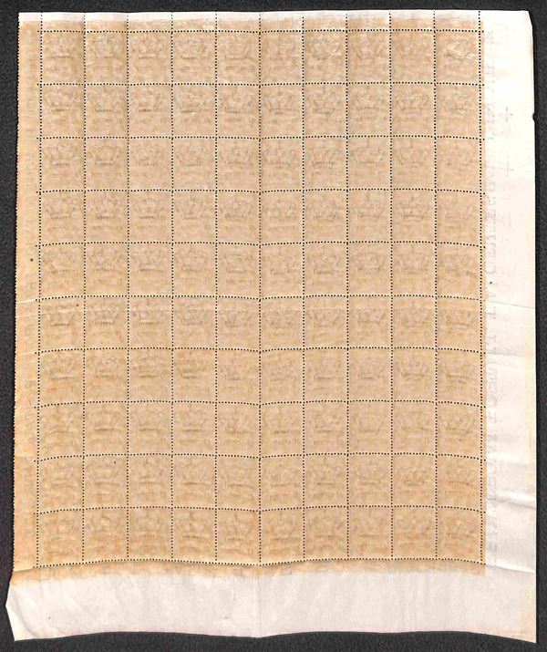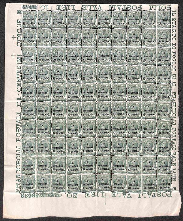 1919 - Intero foglio completo di margini e numero di Tavola del 5 cent su 5 cent (3) con diversi errori di composizione - gomma integra