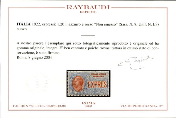 1922 - 1,20 lire Non Emesso (8) - gomma integra - molto ben centrato e fresco - cert. Raybaudi