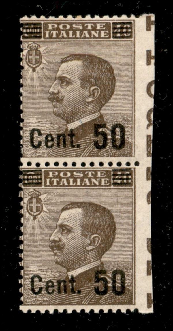 1923 - 50 cent su 40 Michetti (139w) - coppia verticale bordo di foglio non dentellata a destra - gomma integra - Savarese Oliva Bruno