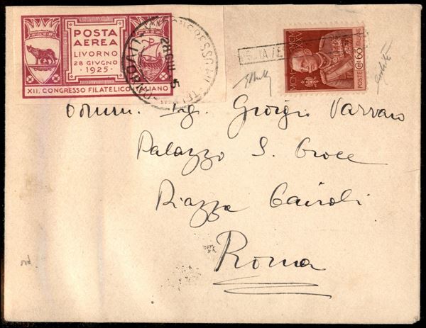 1925 (28 giugno) - Livorno Roma - Posta Aerea Eccezionale - Longhi 1374 - Vignetta non dentellata - Gigliotti + Chiavarello