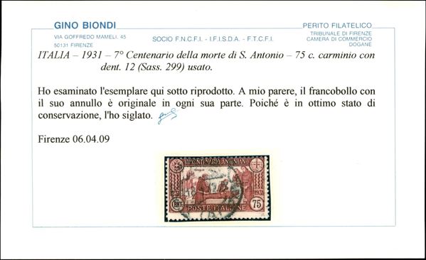 1931 - S. Antonio (292/298 + 299) - serie completa + 75 cent dent. 12 - usati - 299 firmato + cert. Biondi