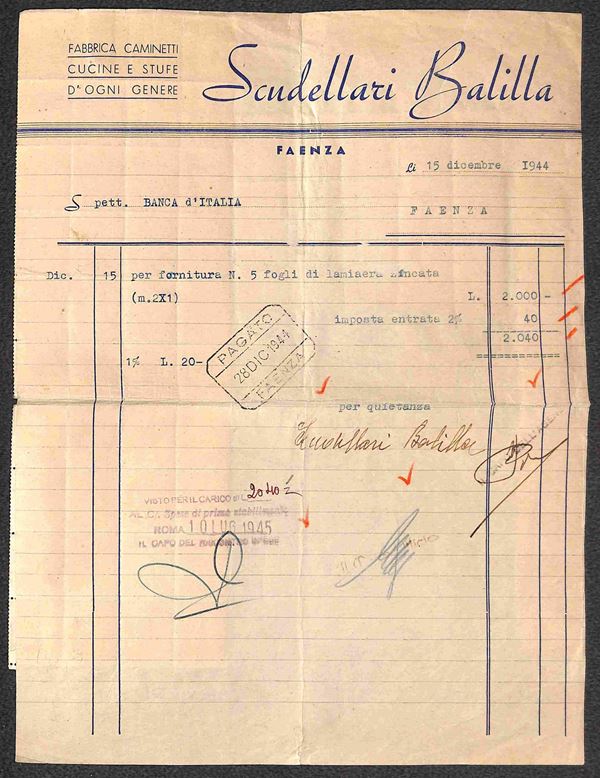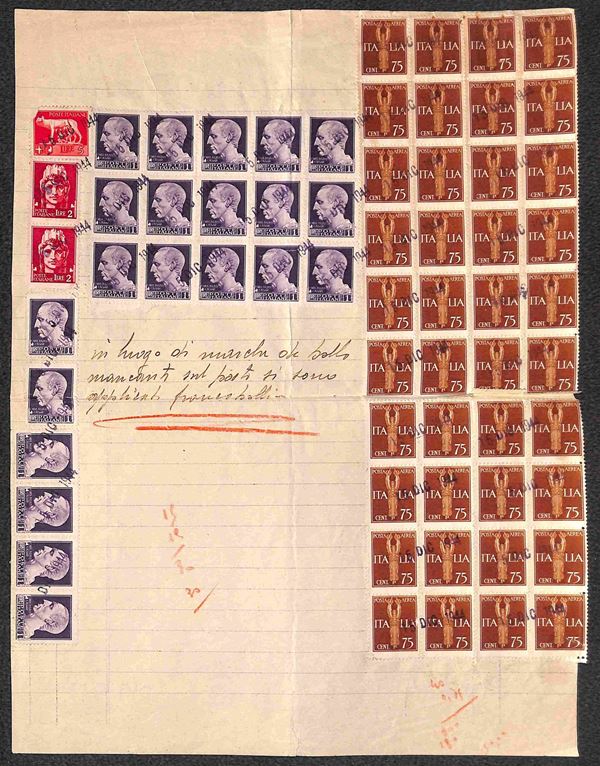 1944 - Faenza (15 dicembre) - fattura quietanzata al retro con valori Imperiale ("in luogo di marche da bollo mancanti sul posto") singoli e in blocchi per complessive 100 lire (252A ventuno + 255 coppia + 257 + Aerea 12 quaranta) usati fiscalmente - insieme non comune - piega centrale a croce