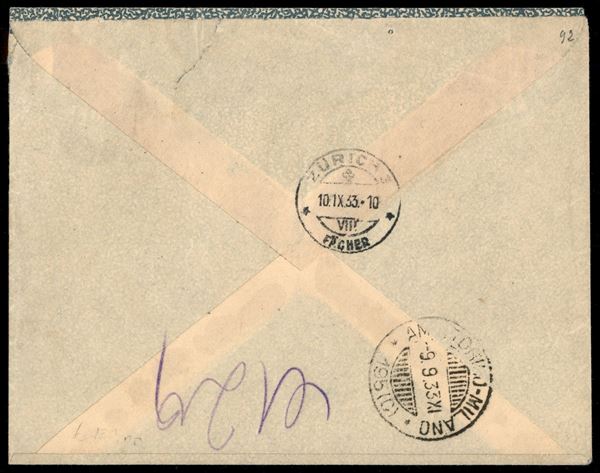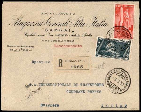 2,55 lire Decennale (338) + complementare (342) su raccomandata da Biella a Zurigo del 9.9.33 - Raybaudi