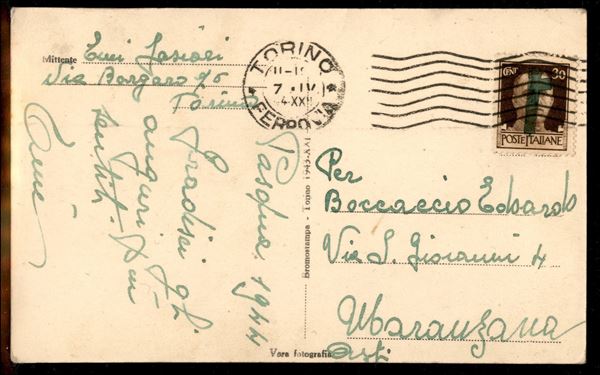 30 cent con fascio dipinto a mano su cartolina da Torino a Asti del 7.4.44