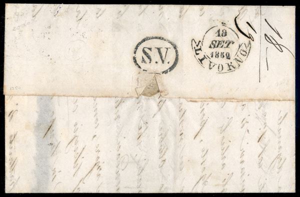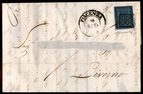 40 cent azzurro chiaro (5a) isolato su lettera da Piacenza a Livorno del 16.9.1852 - ottimi margini - indirizzo ricoperto - G. Chiavarello + S. Sorani