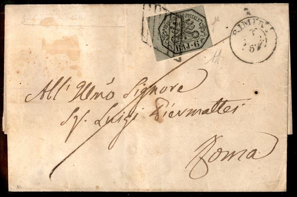 6 bai (7) bordo foglio - isolato su lettera da Rimini a Roma del 3.7.1857 - A. Fiecchi + A. Diena