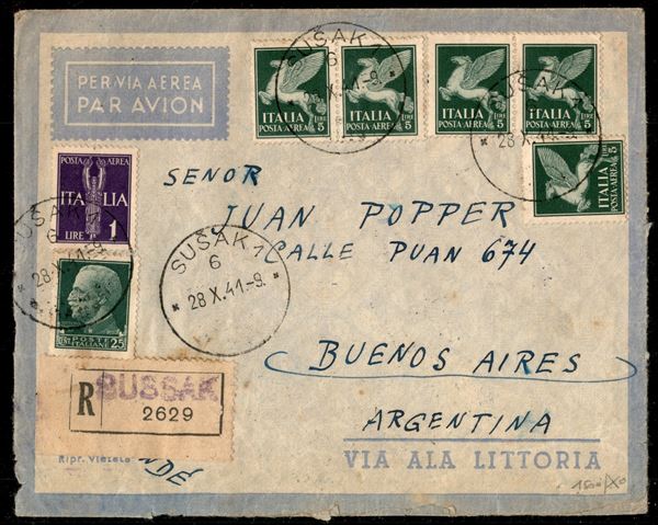 Aerogramma raccomandato censurato per Buenos Aires con affrancatura multipla Imperiale (Aerea 14 + 16 (5) + 248) - da Susak 28.10.41