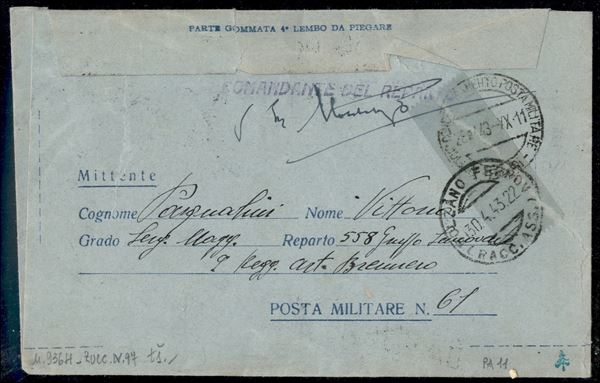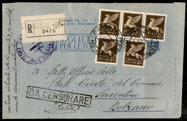 Biglietto postale in franchigia raccomandato affrancato con blocco di quattro a seggiola + singolo del 50 cent bruno Posta Aerea dalla Posta Militare N° 61 26.4.43 per Bolzano con timbro in cartella Da Censurare - ex coll. Provera