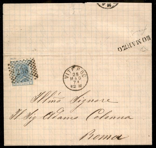 Bonarzo (P.ti 8) - lettera affrancata con 20 cent azzurro chiaro (T26b) per Roma del 25.5.71 - raro uso di annullo Pontificio - ex coll. Provera - Diena