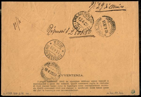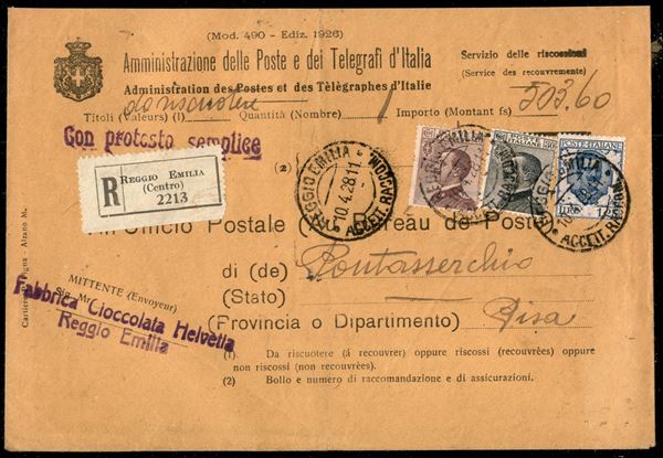 Busta raccomandata 10.4.28 con affrancatura Michetti/Floreale (204 + 185 + 202) - ex coll. Provera