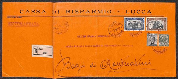 Busta raccomandata da Lucca 5.9.27 affrancata con 5 lire Milizia ed altri valori (209 + 206 + 185 + 81) - viaggiata - ex coll. Provera