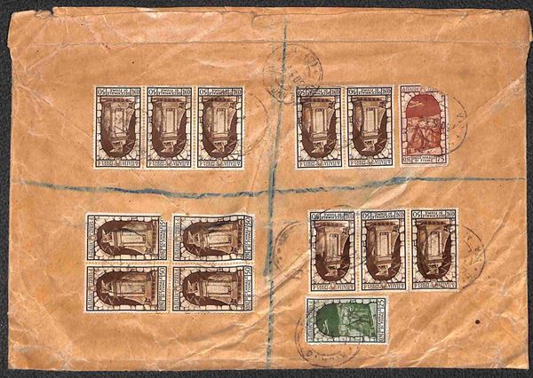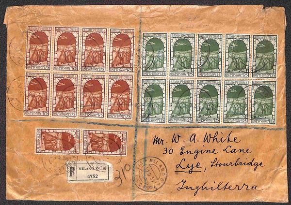 Busta raccomandata da Milano 10.5.34 con affrancatura multipla aerea fronte/verso Decennale di Fiume (Aerea 60 (11) + 61 (12) + 62 (11)) - qualche imperfezione - non comune - per l'Inghilterra