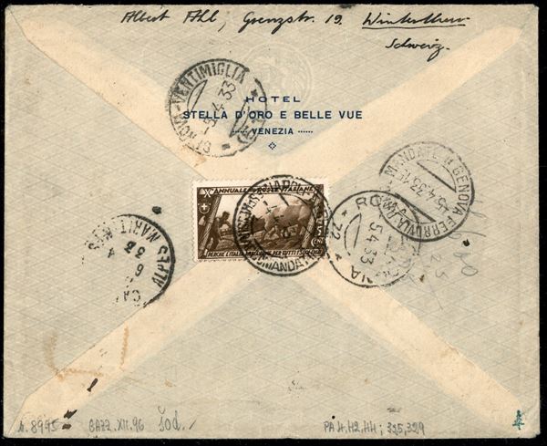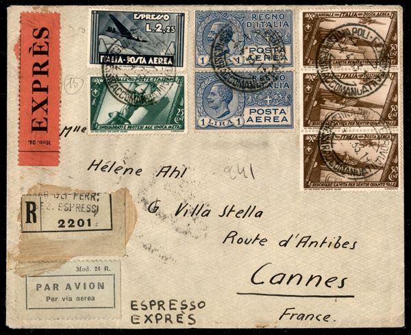 Busta raccomandata espresso da Napoli 4.33 viaggiata con affrancatura plurima (325 + 329 + Aerea 4 + 42) - ex coll. Provera