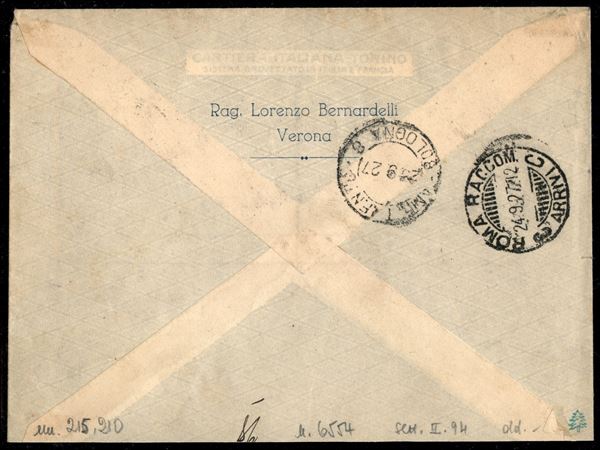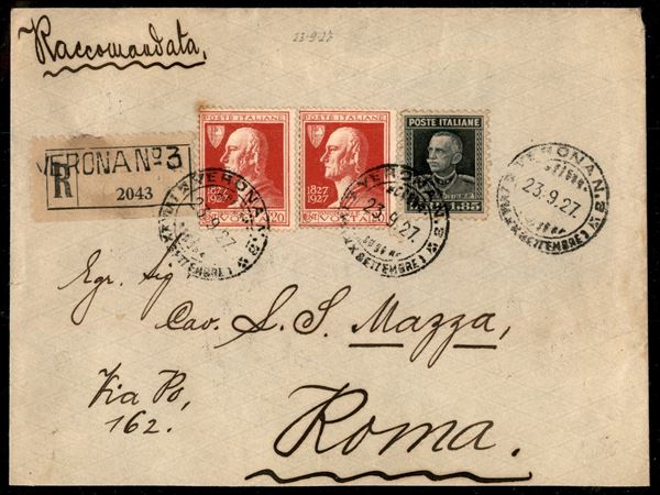 Busta raccomandata viaggiata affrancata con Volta/Parmeggiani (215 + 210) - 23.9.27 - ex coll. Provera