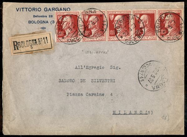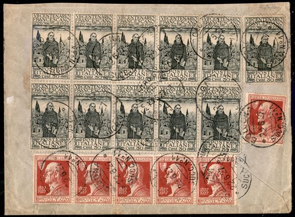 Busta raccomandata viaggiata affrancata frontre/verso con undici esemplari del 20 cent Volta (210) ed altrettanti 30 cent S. Francesco (198) - interessante per la brevità d'uso di questa affrancatura - ex coll. Provera