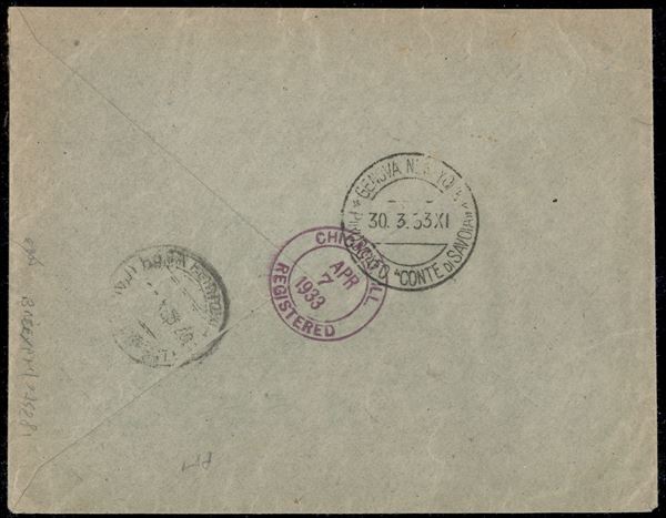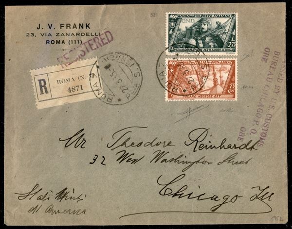 Busta raccomandata viaggiata da Roma 27.3.33 affrancata con due valori Decennale (339 + Aerea 43) - Sorani
