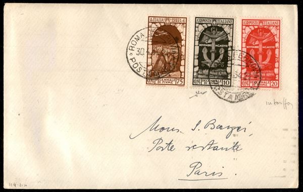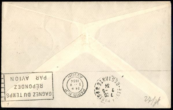 Busta viaggiata da Roma 30.4.34 per Parigi affrancata con tre valori Annessione Fiume (350/1 + Aerea 62) - in tariffa - Chiavarello