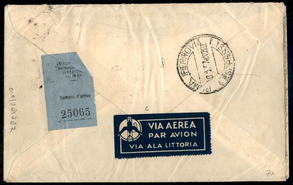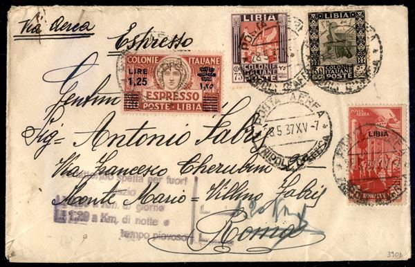 Busta viaggiata da Tripoli per Roma con affrancatura multipla - a lato "Al fattorino spetta per fuori dazio L. 0,60 a km di giorno...L. 1,20 per km 2) - di grande interesse