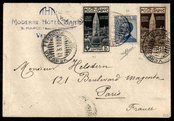 Busta viaggiata da Venezia 17.5.12 per Parigi affrancata con i due valori per il campanile di S. Marco e complementare (97/8 + 83) - Sorani