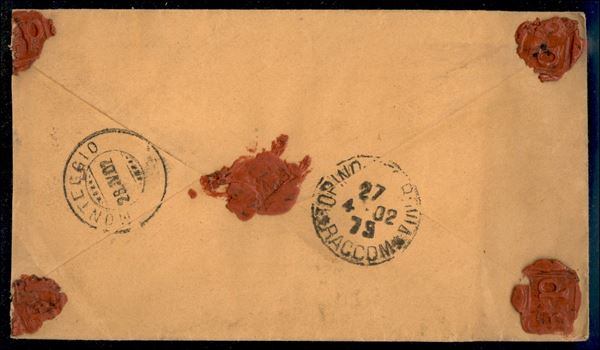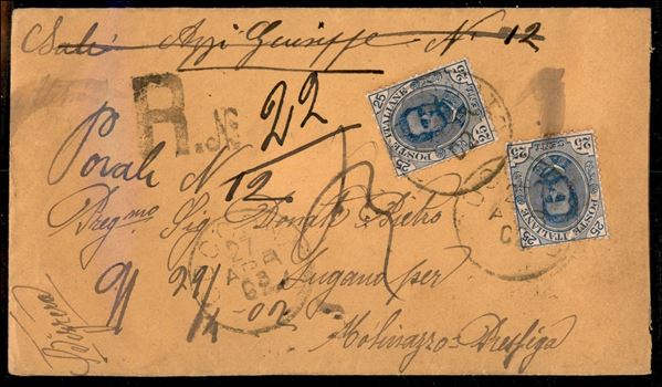 Bustina raccomandata per la Svizzera da Cocconato 27 apr. 02 a Molinazzo affrancata con due esemplari 25 cent azzurro (62)