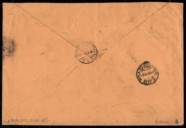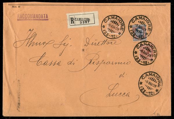 Bustone raccomandato da Camaiore (33-12) 5 giu 29 a Lucca con affrancatura tricolore tre emissioni - 5 lire azzurro e rosa Floreale + 10 cent rosa Leoni + 5 cent arancio Effigie V. Emanuele III (78 + 82 + 240) - ex coll. Provera