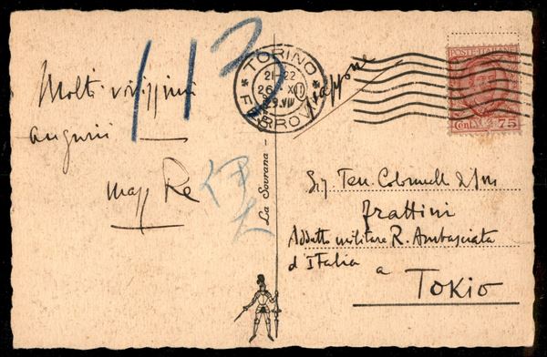 Cartolina per Tokio da Torino 26.XII.29 con 75 cent carminio e rosa Floreale (201)