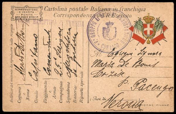 Comando V° Gruppo di Sezioni Aerostatiche - cartolina postale in franchigia dalla Piazza Marittima di Venezia per Verona del 2.6.17