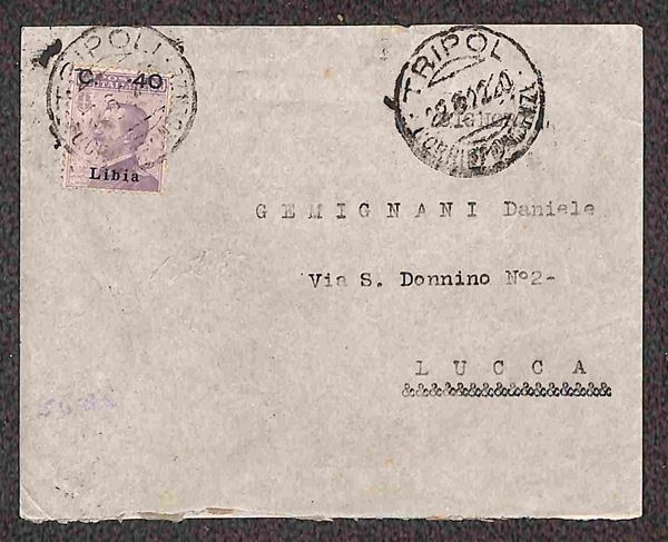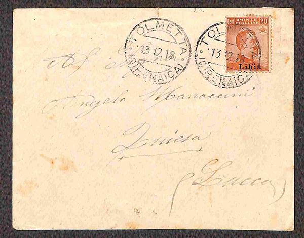 Due buste da Tolmetta (13.12.18) e Tripoli (22.6.22) per l'Italia con diverse affrancature singole (6 - 38)