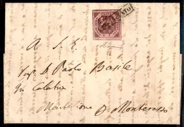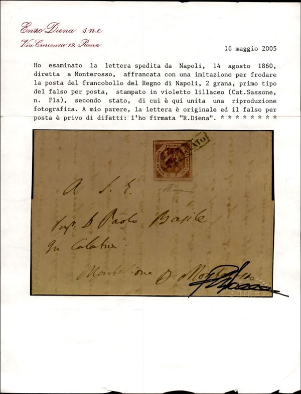 Falso per posta - 2 grana (F1a - secondo stato) su lettera da Napoli a Monterosso del 14.8.60 - ex coll. Provera - cert. Diena