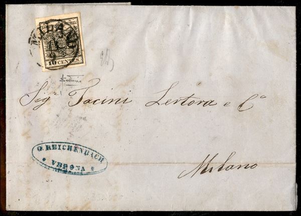 Forwarder - 10 cent (19 - carta a macchina) isolato su lettera da Verona del 12.9.1857 annullato a Milano (13.9) - Emilio Diena + cert. Sottoriva