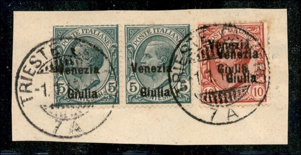 Frammento con 10 cent (22b) con doppia soprastampa + coppia del 5 cent (21) - Trieste 1.1.19