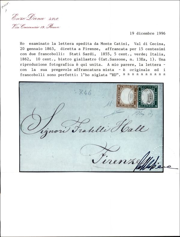 Fresca lettera da Montecatini di Cecina 20.1.63 affrancata con 10 cent (1) pił 5 cent Sardegna ( 13Ea) - di pregio - ex coll. Provera - AD + Oliva + cert. ED