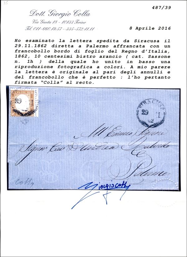 Fresca lettera da Siracusa (CS Palme - P.ti R1) 29.11.62 affrancata con 10 cent (1h) bordo di foglio bene dentellato - rarità - cert. Colla