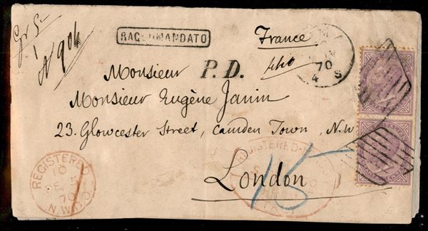Griglia di Roma (P.ti 7) - coppia del 60 cent (21) su intero frontespizio di bustina raccomandata per Londra del 30.11.70