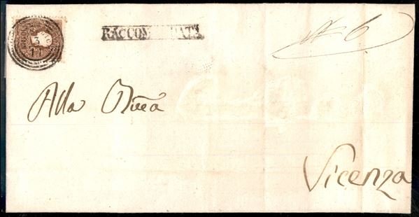 Involucro di piego raccomandato da Monselice 3.11 per Vicenza affrancato recto-verso con due esemplari 10 cent bruno (31)