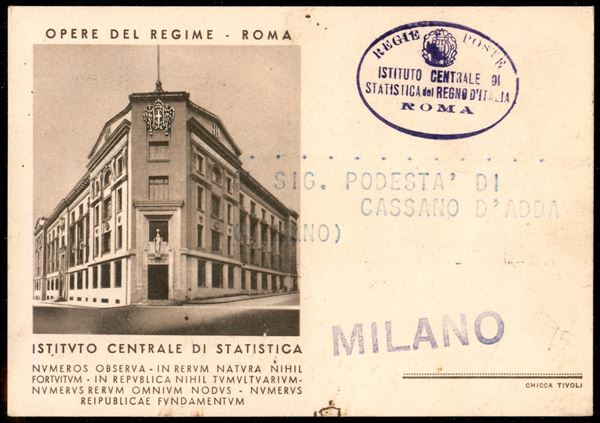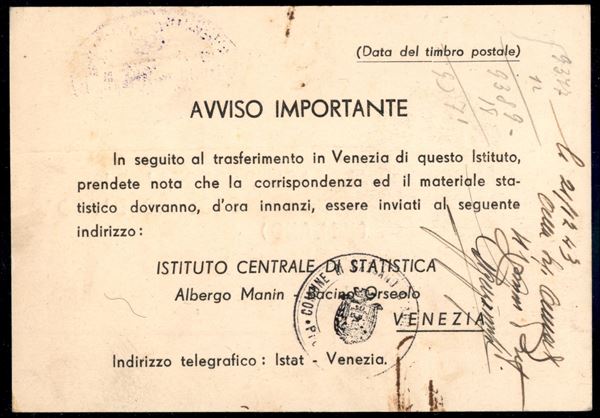 Istituto Centrale di Statistica - Trasferimento a Venezia dell'Istituto - cartolina avviso da Roma del 21.12.1943