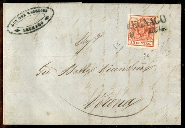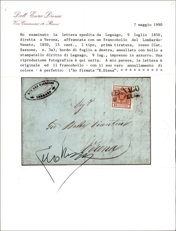 Legnago (azzurro - P.ti 12) - 15 cent (3a) bordo foglio - lettera per Verona del 9.7.1850 - Emilio Diena + cert. En. Diena