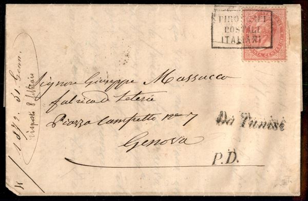 Lettera affrancata con 40 cent rosa carminio DLR annullato con bollo in cartella Piroscafi Postali Italiani e a lato corsivo Da Tunisi e bollo PD - destinazione Livorno - ex coll. Provera
