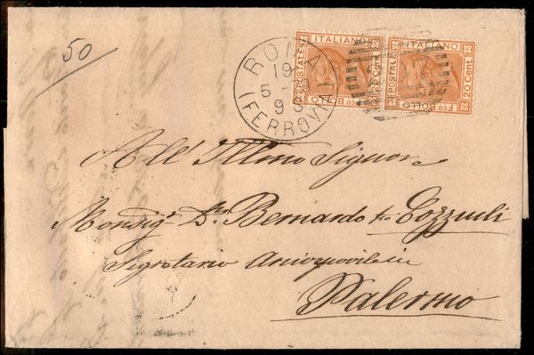 Lettera affrancata con coppia verticale del 20 cent V. Emanuele II (28) da Roma a Palermo del 19.5.78 - ex coll. Provera