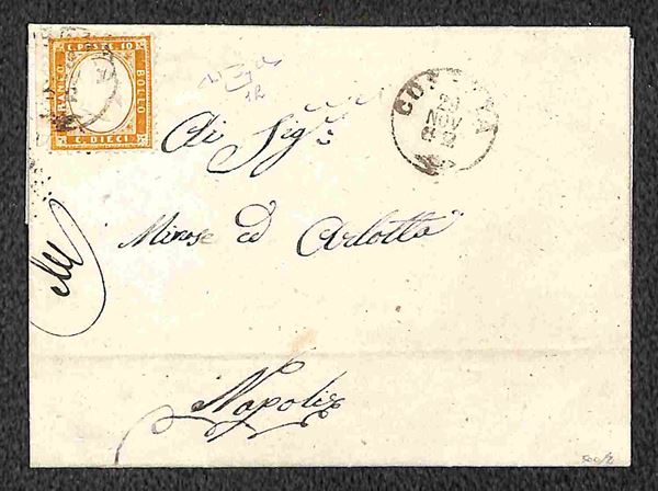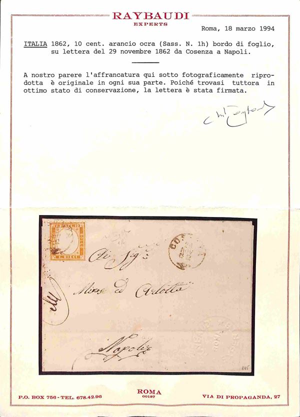 Lettera da Cosenza 29 nov. 62 per Napoli con 10 cent arancio ocra (1h) bordo di foglio a sinistra - cert. Raybaudi
