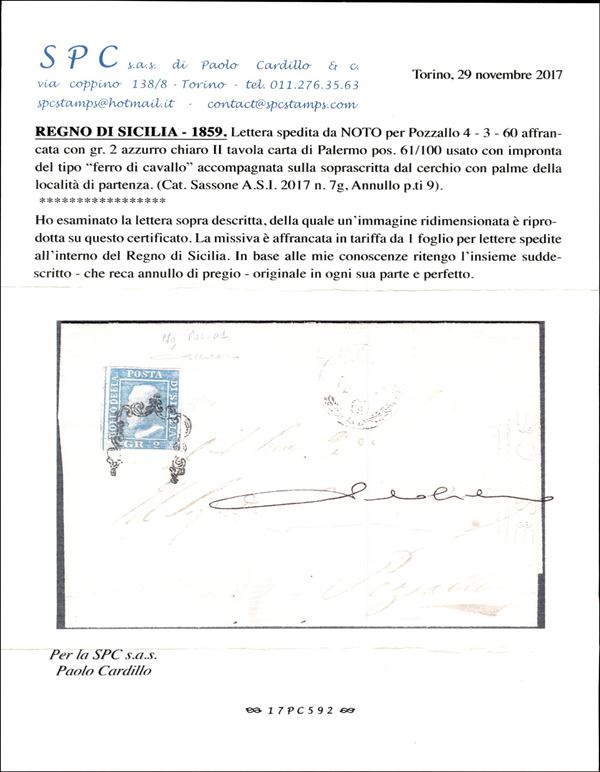Lettera da Noto 4.3.60 (P.ti 9) recante 2 grana (7g) bene marginato (Pos. 61) - Chiavarello