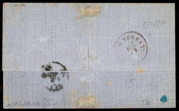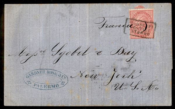 Lettera da Palermo a New York impostata al battello affrancata con 40 cent rosa carminio (20) annullato con bollo in carella Piroscafi Postali Interno apposto in transito a Napoli come attesta il bollo dell'agosto 1875 apposto al verso - ex coll. Provera