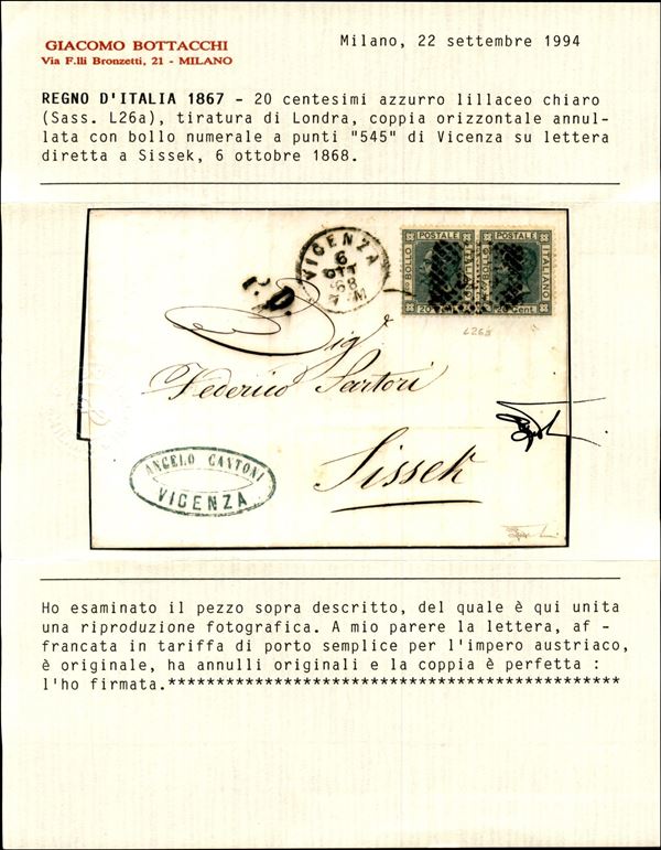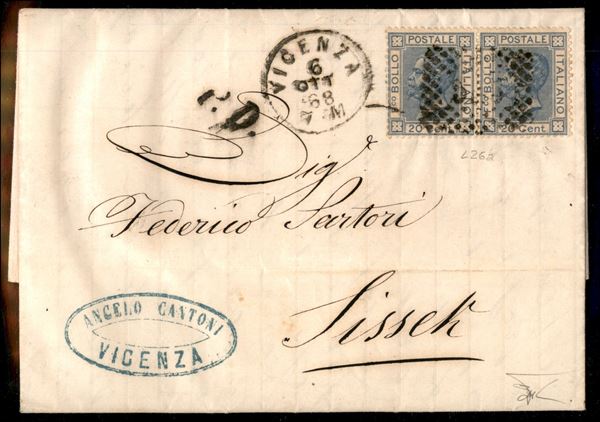 Lettera da Vicenza 6.10.68 recante coppia bene dentellata del 20 cent azzurro lillaceo chiaro (L26a) - ex coll. Provera - cert. Bottacchi