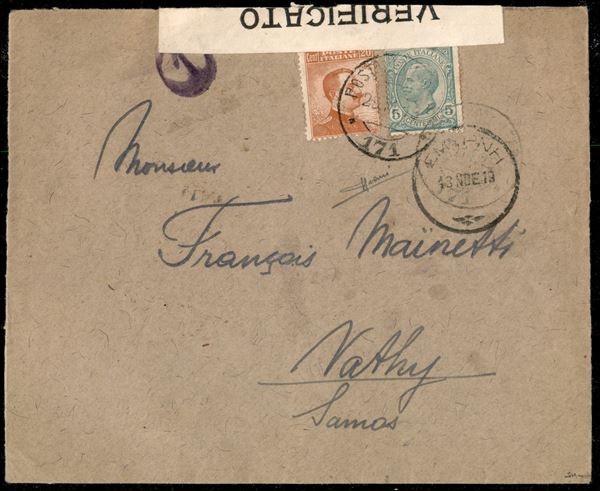 Lettera della Posta Militare 171 29 nov. 19 per Vathy (isola di Samos - Grecia) affrancata con Leoni 5 cent verde + Michetti 20 cent arancio - con censure