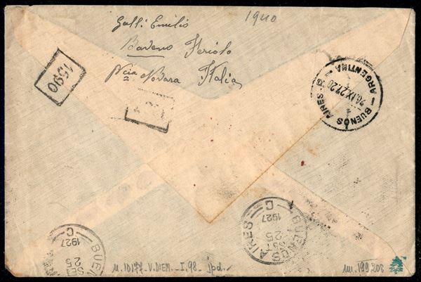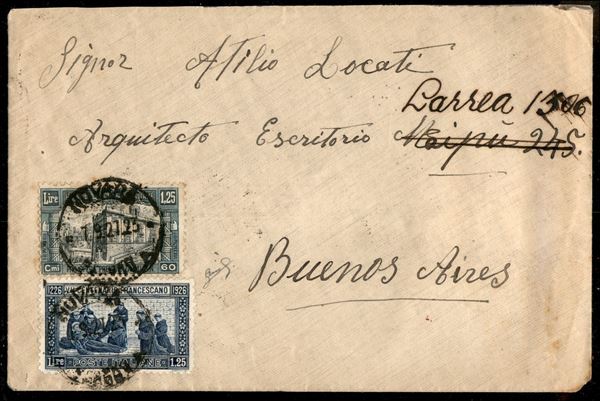 Lettera per Buenos Aires affrancata con valori gemelli S. Francesco 1,25 lire dent. 11 (199) + Milizia 1,25 lire ardesia e nero (208) con bollo d'arrivo - ex coll. Provera