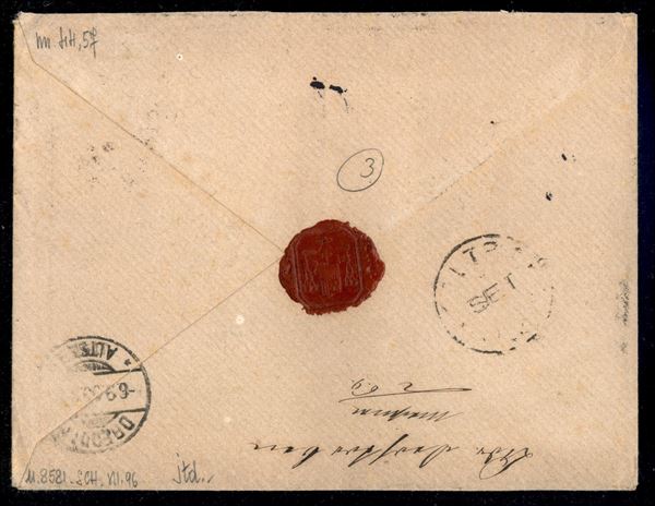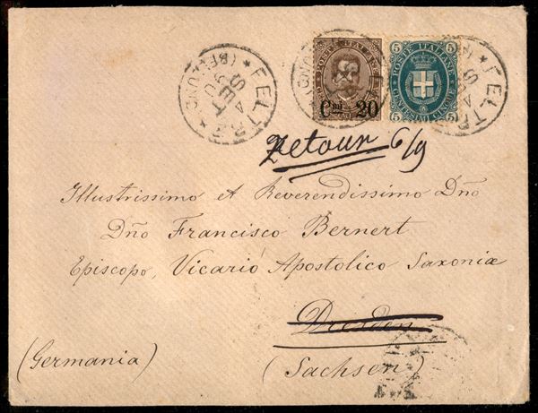 Lettera per la Sassonia da Feltre 4 set. 90 a Dresda affrancata con 5 cent verde Stemma + soprastampato 20 cent su 30 bruno (44 + 57) rispedita al mittente - ex coll. Provera