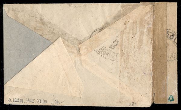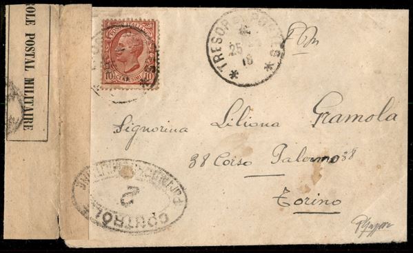 Lettera per Torino affrancata con 10 cent Leoni (82) annullato Tresor et Postas 25.7.18 con numero scalpellato timbri e fascetta della censura militare francese - ex coll. Provera
