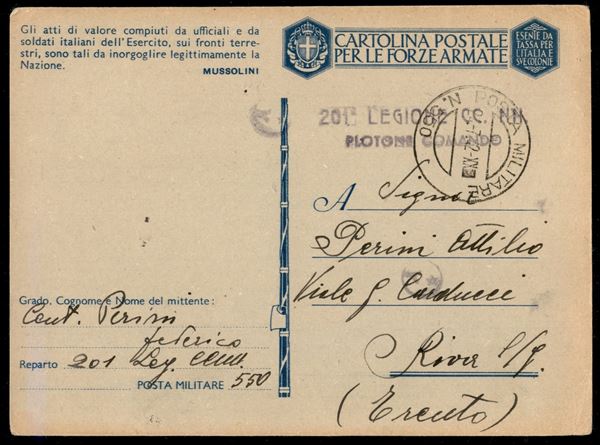 Posta Militare N. 550 (201 Legione CC.NN./Plotone Comando) - cartolina postale in franchigia da Rodi a Riva del 24.7.42 (prima data nota)